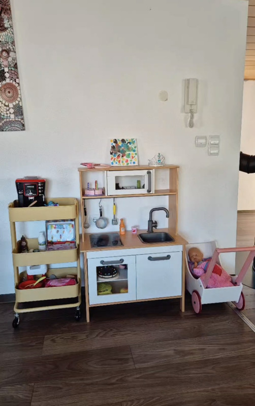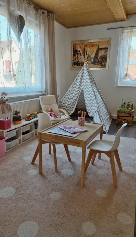 Kinder haben besondere Bedürfnisse an die Einrichtung: der Waschbereich hat einen Wickeltisch, niedrige Waschbecken und eine separate Toilette. Für den Mittagsschlaf oder um sich auszuruhen gibt es den Schlafbereich mit einer eigenen Matratze für jedes Kind. Die Küche ist besonders wichtig: hier bereiten wir – auch oft gemeinsam mit den Kindern – die Mahlzeiten zu und lassen es uns zusammen am großen Tisch schmecken. In den Räumen gibt es verschiedene Bereiche zum Basteln oder Spielen – mache Bereiche werden auch für verschiedene Anlässe umgeräumt. In den Räumen wird natürlich nicht geraucht.